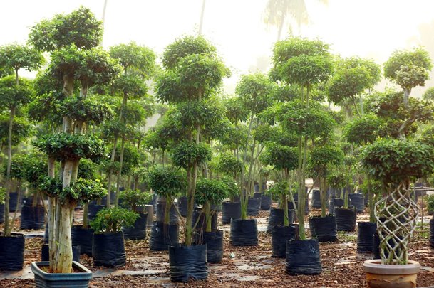 Create a dramatic landscape effect with these Premium Ficus Bonsai Forest trees. These tall, multi-tiered bonsai are grown in grow bags for ease of transport and transplantation. With layered foliage and upright form, they offer a stunning architectural element for gardens, driveways, resorts, and office complexes. The structured pruning style promotes strong vertical growth while maintaining dense green canopies. These ficus topiaries are resilient to heat and pruning, making them ideal for tropical and subtropical climates.